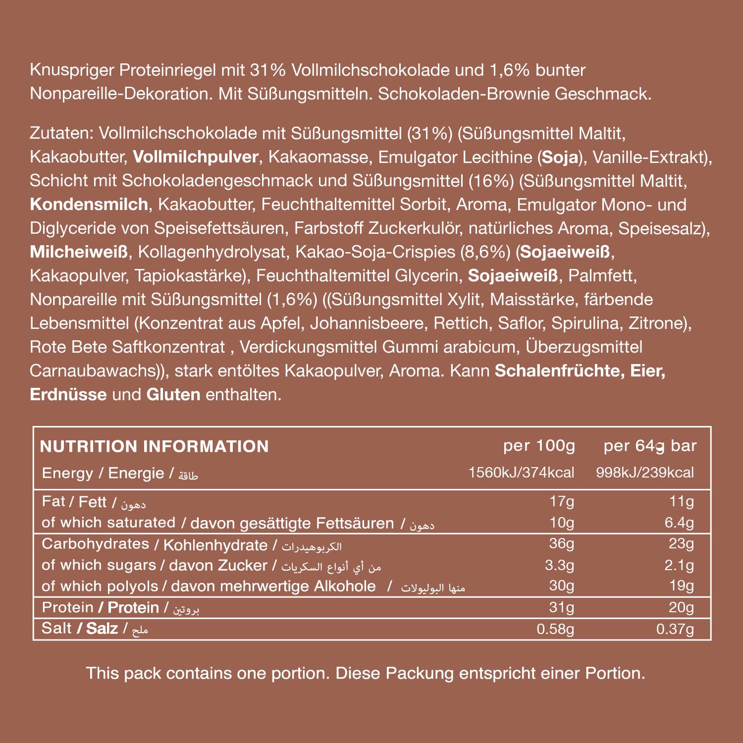 麥芽糖醇牛奶巧克力塗層(31%)(甜味劑麥芽糖醇、可可脂、全脂奶粉、可可塊、乳化劑大豆卵磷脂、天然香草味)、甜味劑麥芽糖醇、牛奶蛋白、膠原蛋白水解物、大豆脆片(大豆分離蛋白、米粉、麥芽大麥萃取物(麩質)、鹽)、保濕劑(甘油、山梨糖醇)、大豆分離蛋白、水、棕櫚油、煉乳、調味料、乳化劑脂肪酸單甘油酯和雙甘油酯、填充物微晶纖維素、鹽、著色劑(焦糖、β-胡蘿蔔素)。