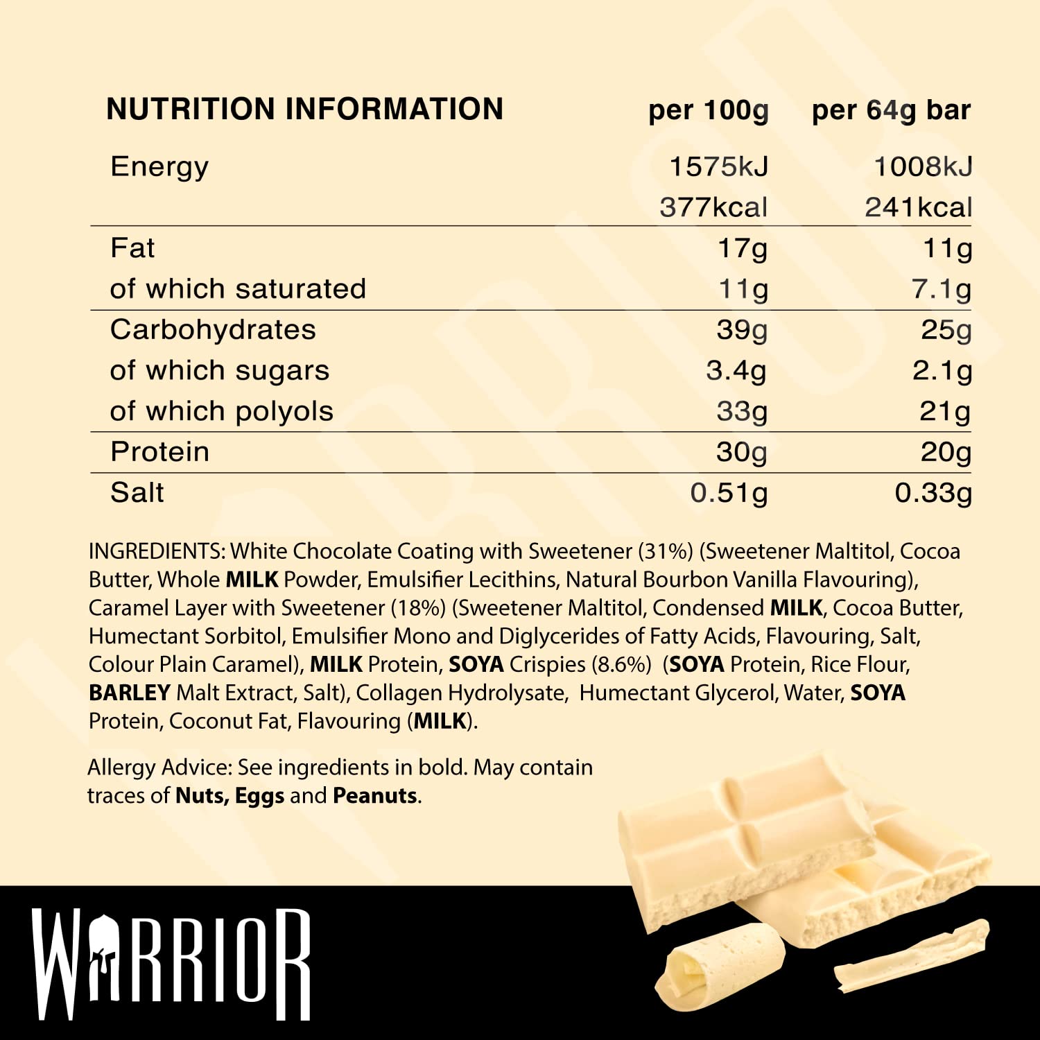 麥芽糖醇牛奶巧克力塗層(31%)(甜味劑麥芽糖醇、可可脂、全脂奶粉、可可塊、乳化劑大豆卵磷脂、天然香草味)、甜味劑麥芽糖醇、牛奶蛋白、膠原蛋白水解物、大豆脆片(大豆分離蛋白、米粉、麥芽大麥萃取物(麩質)、鹽)、保濕劑(甘油、山梨糖醇)、大豆分離蛋白、水、棕櫚油、煉乳、調味料、乳化劑脂肪酸單甘油酯和雙甘油酯、填充物微晶纖維素、鹽、著色劑(焦糖、β-胡蘿蔔素)。